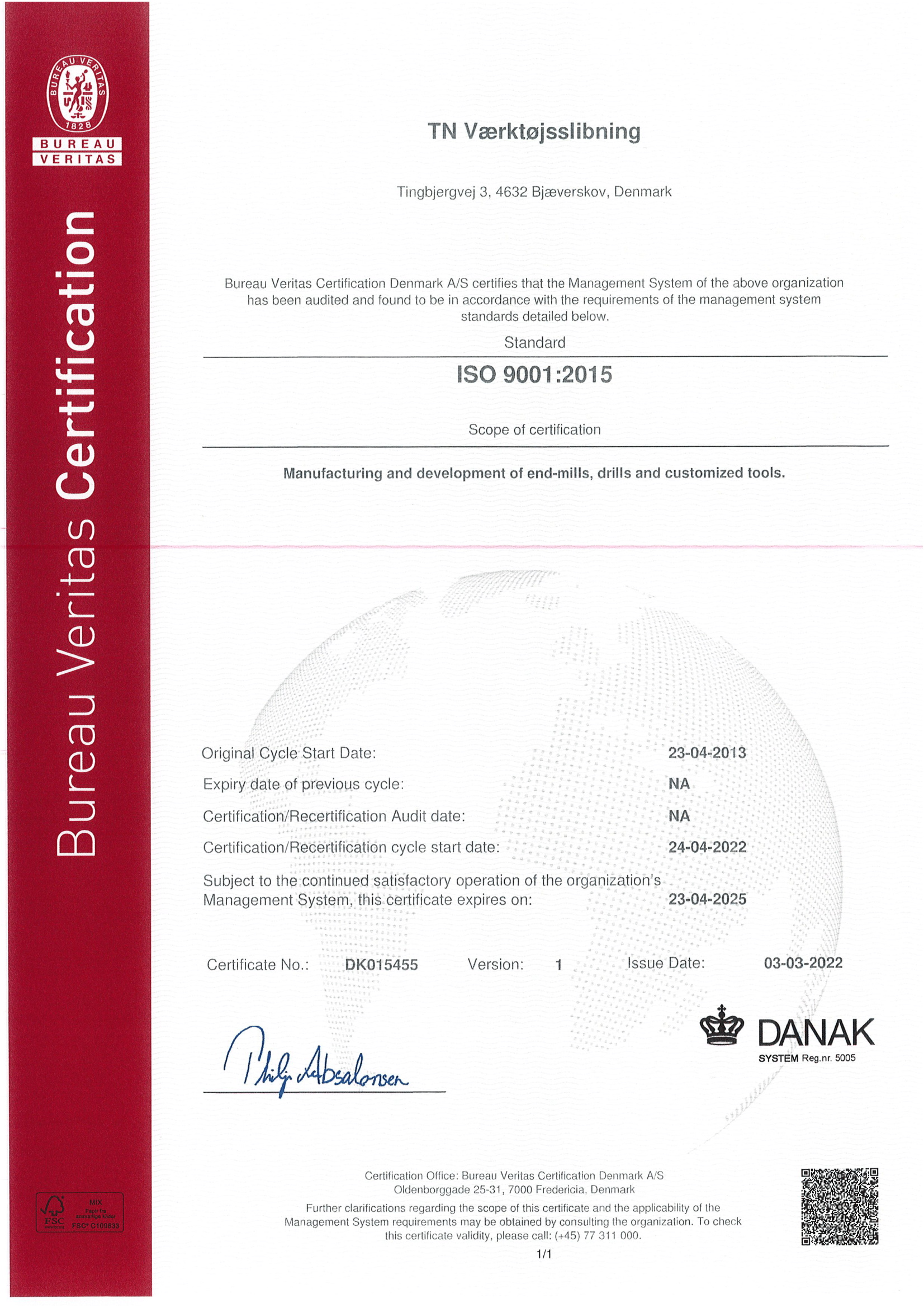 Som et led i forbedringer, er TN tools henholdsvis blevet ISO9001 % ISO14001 certificeret. Certificeringerne og audit heraf, sker løbende og i takt med de krav som bliver imødeset af kunder. I maj 2011, blev TN ISO9001 certificeret hos Bureau Veritas.
