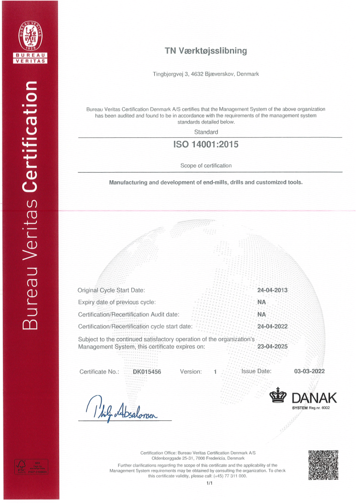 Dette var en større gennemgang af hele virksomheden som skulle ind i nye rutiner og registreringer. Men det har samtidig hjulpet til en mere ensartig process og sporbarhed igennem hele TN tools. I april 2013, blev TN ISO14001 certificeret hos Bureau Veritas, det var et led i vores miljøpolitik.